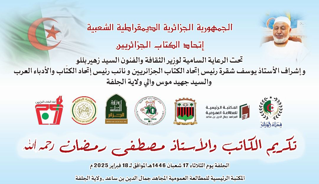تحت رعاية معالي وزير الثقافة والفنون، وسيادة والي ولاية الجلفة، وبإشراف المكتب الوطني لتكاد الكتاب الجزائريين والمكتب الولائي للجلفة، تجتمع هذه النخبة الثقافية اليوم لتكريم رجلٍ من رجالات الفكر والعلم، الأستاذ والكاتب مصطفى رمضان، الذي وهب حياته لنشر المعرفة وتعزيز قيم المحبة والسلام.